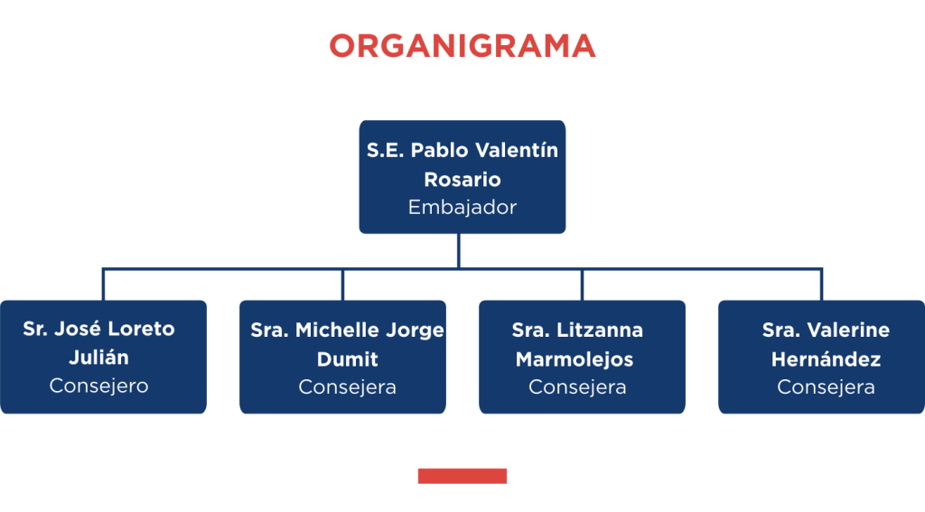 SOBRE NOSOTROS ORGANIGRAMA Estás aquí: Inicio » Sobre Nosotros » Organigrama ENLACES DE LA SECCIÓN ¿Quiénes Somos? Historia Organigrama Embajador Marco Legal Consulados Concurrencias ¿Quiénes Somos? Historia Organigrama Embajador Marco Legal Consulados Concurrencias Imprimir Correo Electrónico